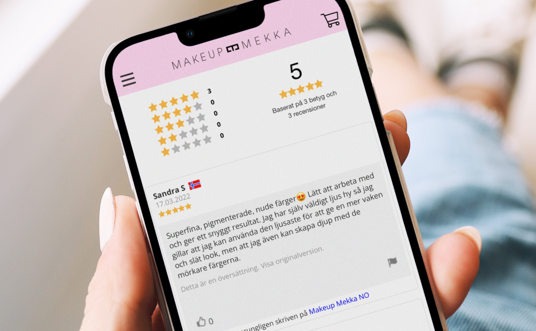 “Vi hade redan många norska recensioner. Men när vi gick in i Sverige, Danmark och Tyskland hade vi ju inga lokala omdömen att visa. Därför var det superviktigt för kunderna att kunna se våra andra recensioner, fast på sitt eget språk.” Säger Berit Sjøvik, VD Makeup Mekka.